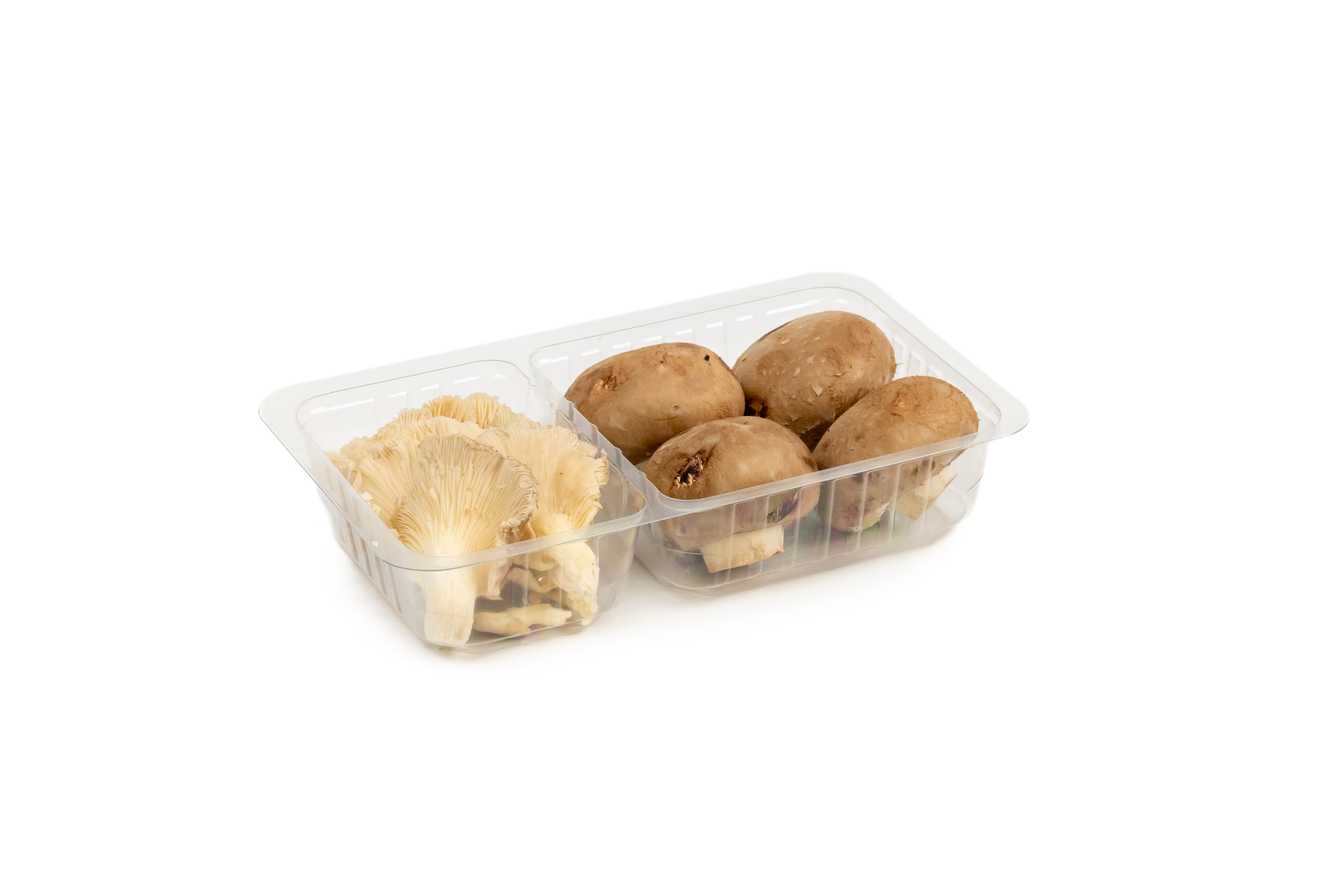 Bandeja em PET/PE termoselável com duas cavidades para acondicionar produtos alimentares.