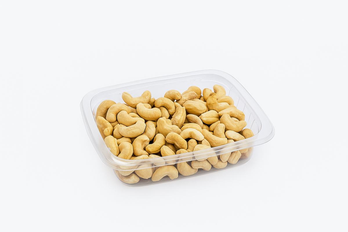 Bandeja em PET/PE termoselável para acondicionar produtos alimentares.