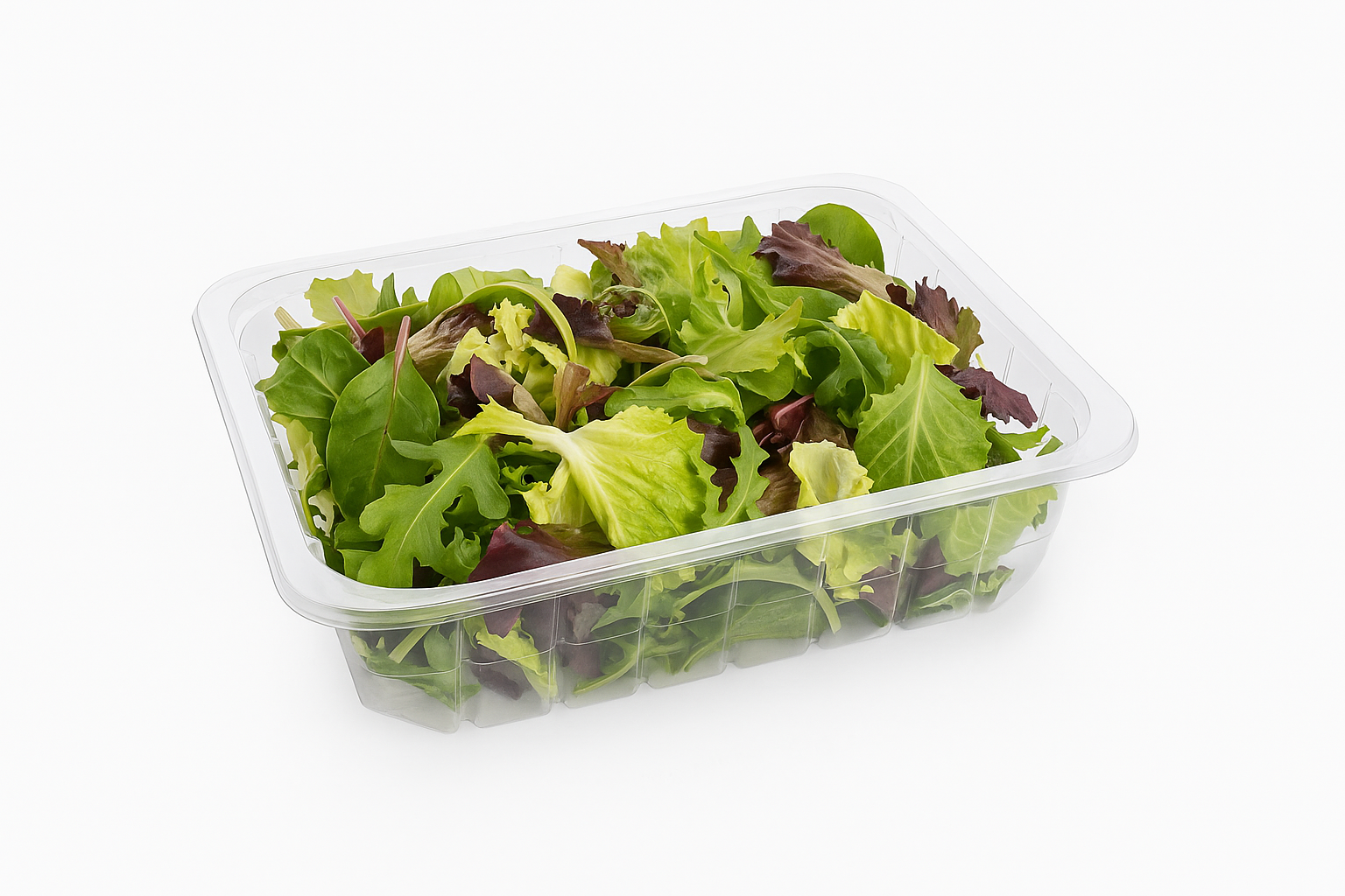 Bandeja em PET/PE termoselável para acondicionar produtos alimentares.