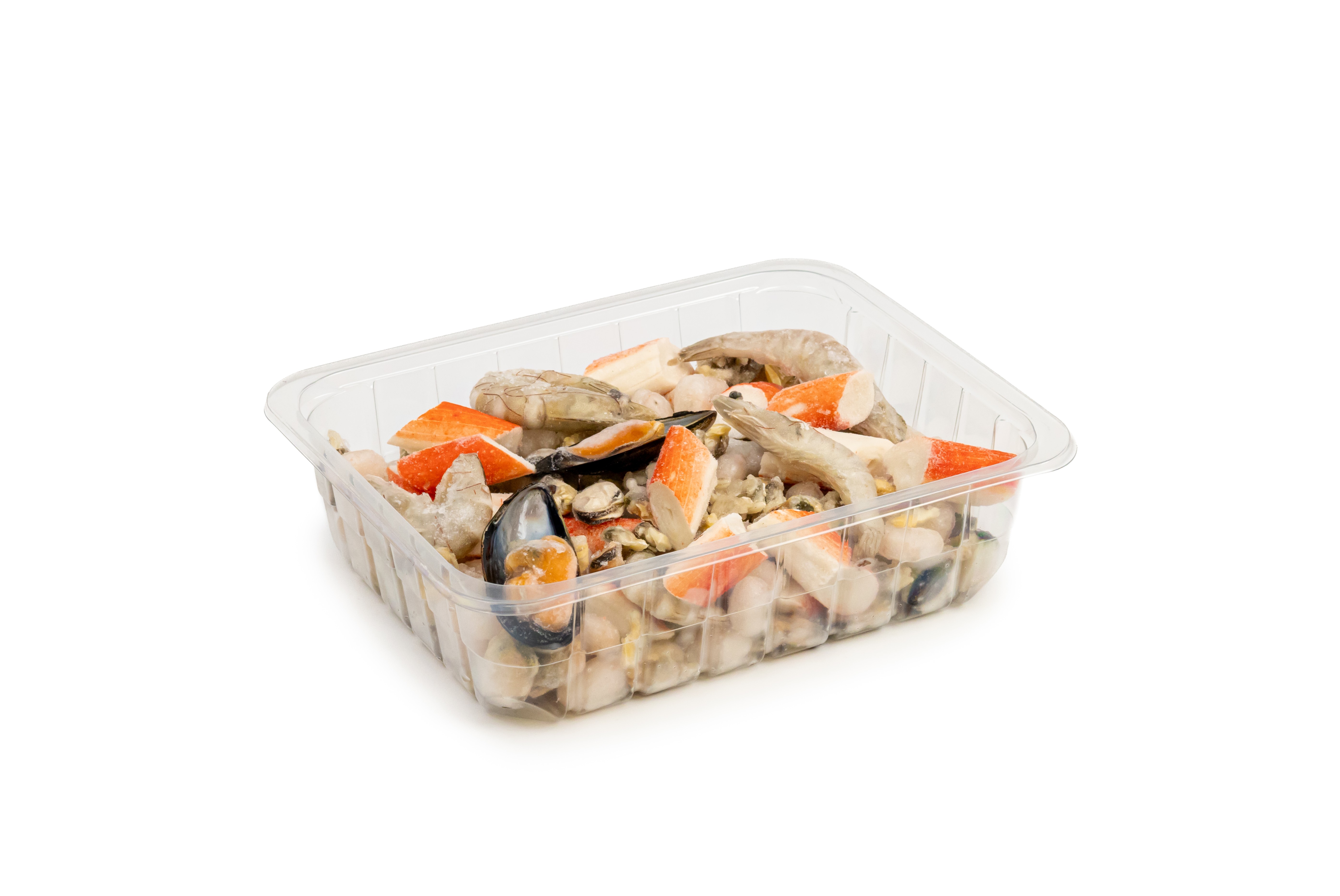 Bandeja em PET/PE termoselável para acondicionar produtos alimentares.