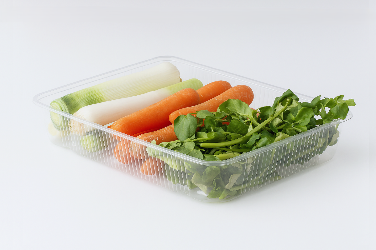 Logitray em PET/PE termoselável para acondicionar produtos alimentares.