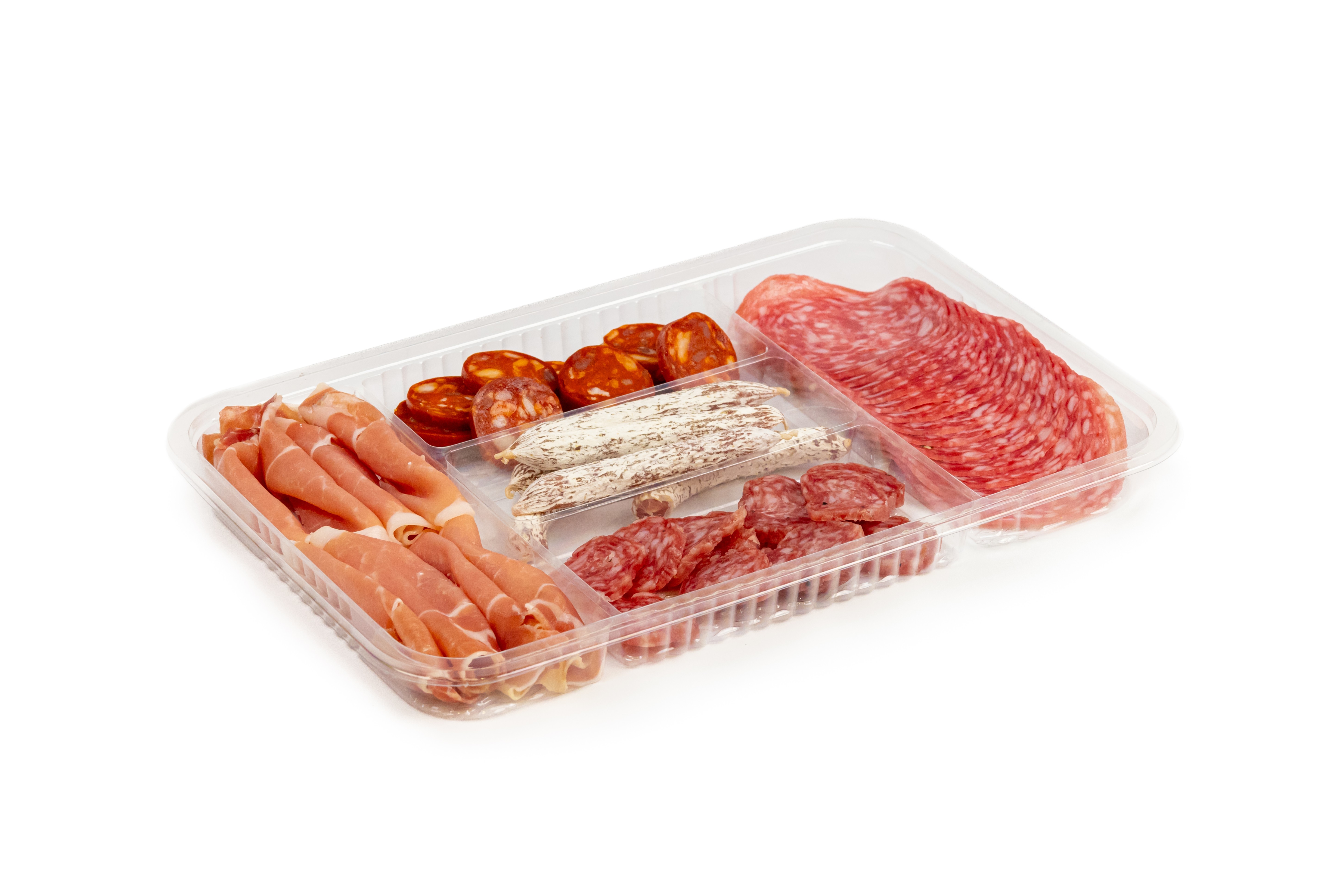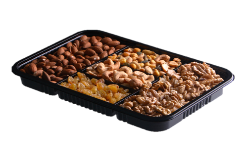Logitray em PET para flowpack, com 5 cavidades, para acondicionar produtos alimentares.